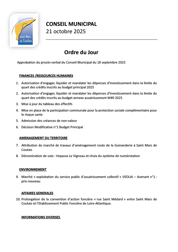 16 octobre PartagerPartager surFBTweetLinkedInPinterest CONSEIL MUNICIPAL OCTOBRE 2025 Mairie | Informations municipales Le prochain Conseil Municipal aura lieu le mardi 21 octobre à 20 heures.