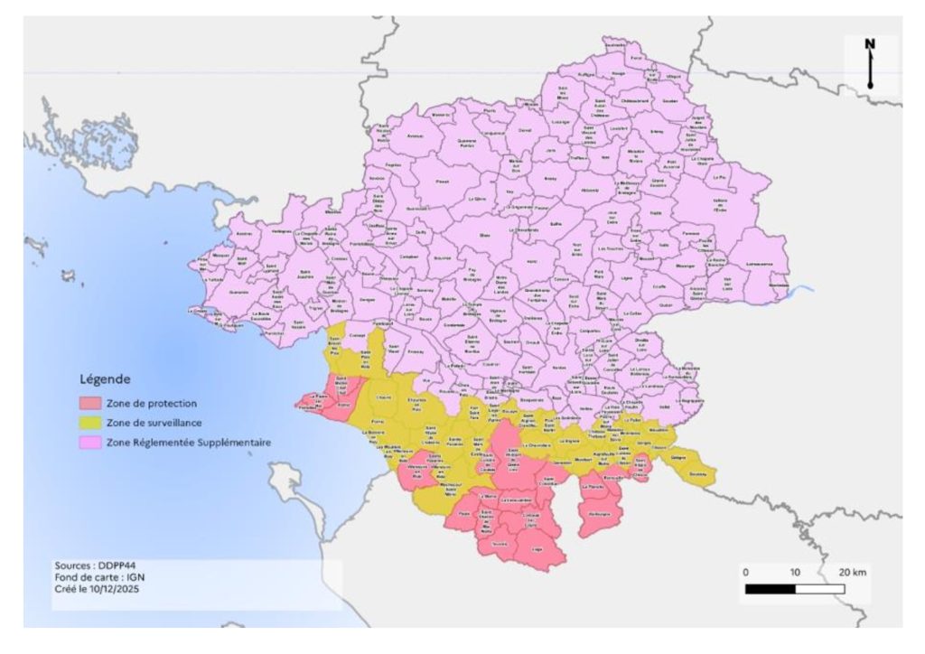 L’arrêté préfectoral n°DDPP/SPA/2025/449 (lien). Fait le 12 décembre celui-ci détermine un périmètre réglementé suite à des foyers d’infection d’influenza aviaire hautement pathogène (IAHP) dans certaines communes de Loire Atlantique.