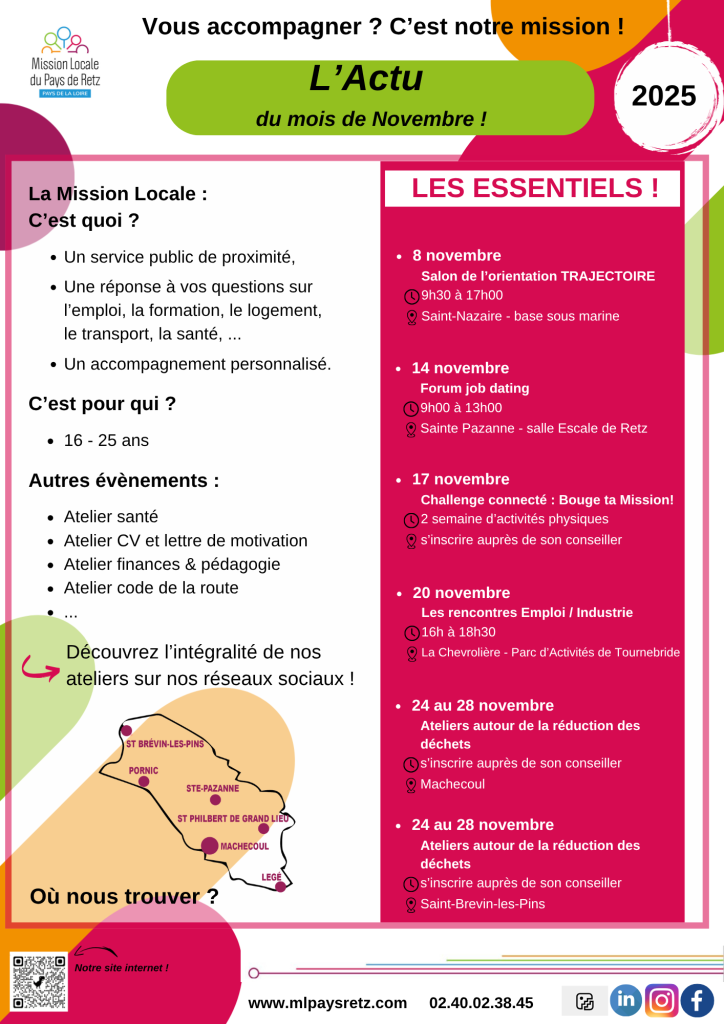03 novembre PartagerPartager surFBTweetLinkedInPinterest Mission locale Pays de Retz – Jeunes 16-25 ans Mairie | Evénement, Informations municipales La Mission Locale du Pays de Retz accompagne les jeunes de 16/25 ans sur les questions : emploi, transport, logement, formation… Contact au 02.40.02.38.45