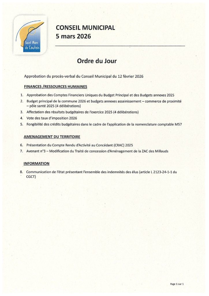 20 février PartagerPartager surFBTweetLinkedInPinterest PROCHAIN CONSEIL MUNICIPAL 5 MARS 2026 Mairie | Informations municipales Le prochain Conseil Municipal aura lieu le jeudi 5 mars 2026 à 19h30, en mairie, salle du Conseil.