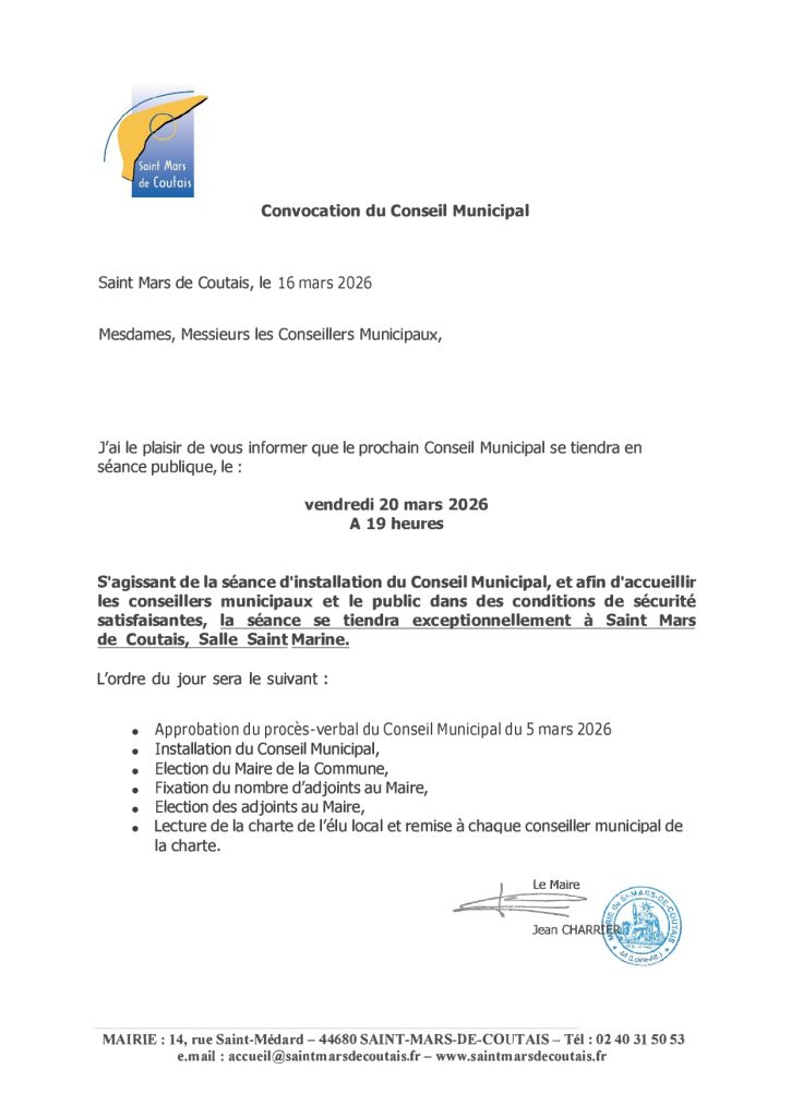 Le prochain Conseil Municipal dédié à l’installation du nouveau Conseil et aux élections du Maire et des adjoints aura lieu le vendredi 20 mars 2026, à 19 heures, salle Saint Marine.